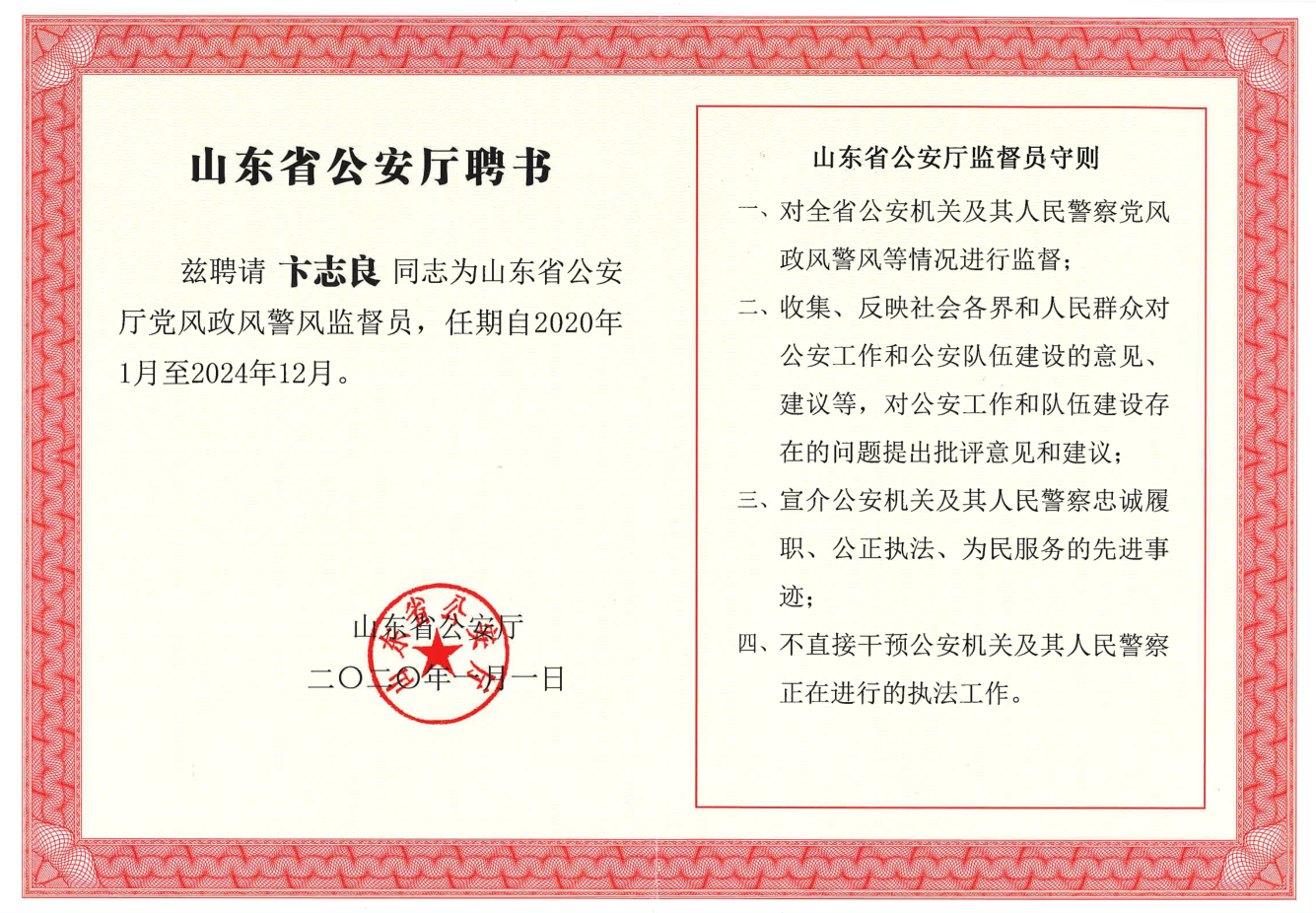 12月31日,为深入践行“对党忠诚、服务人民、执法公正、纪律严明”总要求,进一步加强对公安机关的外部监督,密切公安机关与社会各界和广大人民群众的联系,根据《中华人民共和国人民警察法》等法律法规,公安部设立党风政风警风监督员制度,作为接受人民监督的重要途径和基本制度,按照公安部关于聘任党风政风警风监督员的工作要求,结合山东省实际,经各地推荐,山东省公安厅决定聘请卞志良等110名同志为第九届山东省公安厅党风政风警风监督员,任期5年,自2020年1月至2024年12月。