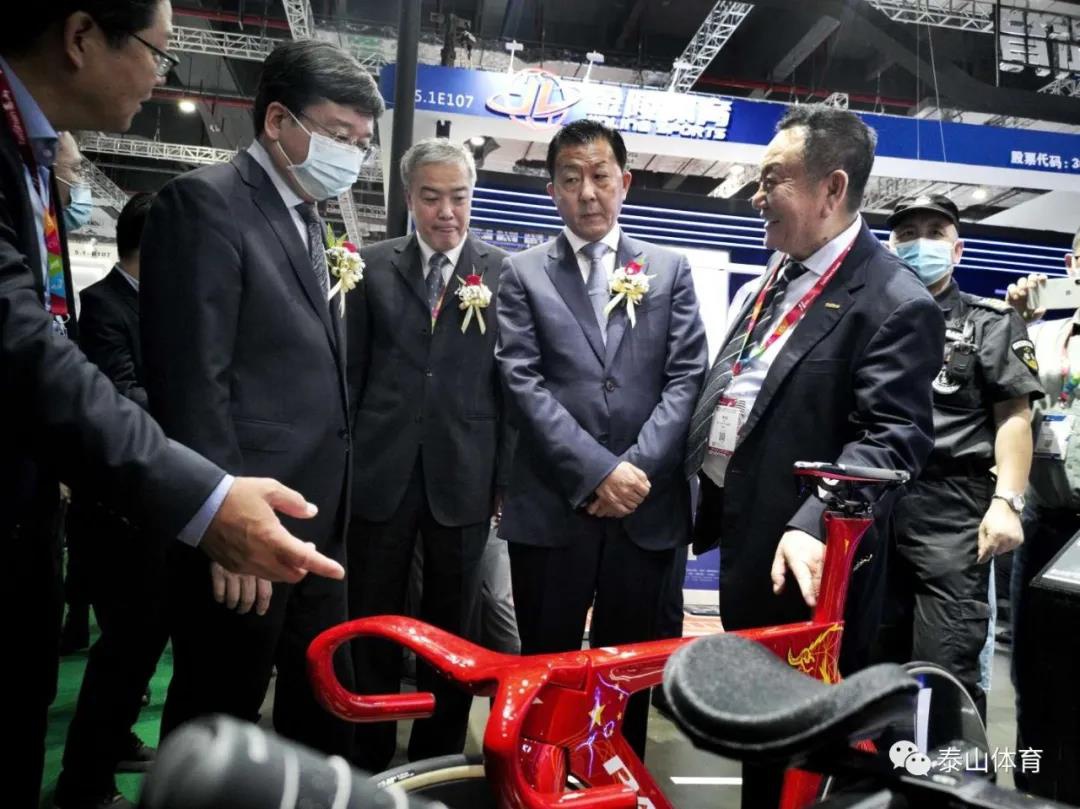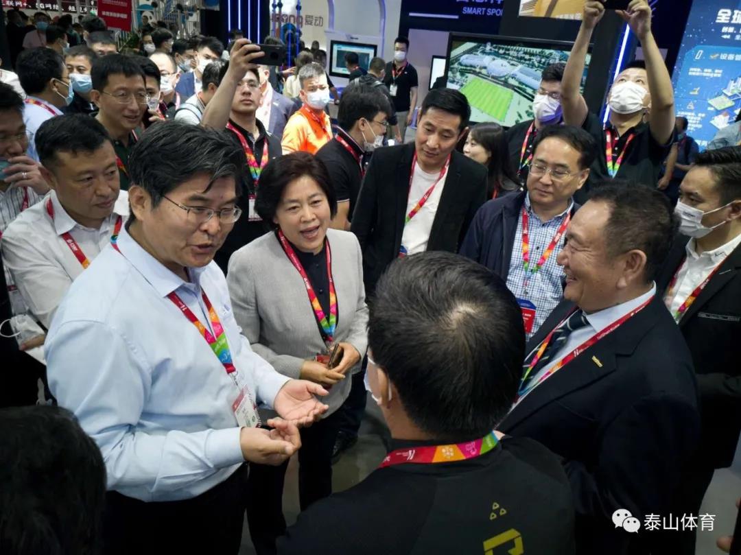 国家体育总局副局长李颖川、上海市副市长陈群、国家体育总局体育器材装备中心主任孙为民、上海市体育局局长徐彬在好博体育产业集团卞志良董事长陪同下参观好博体育展厅。
