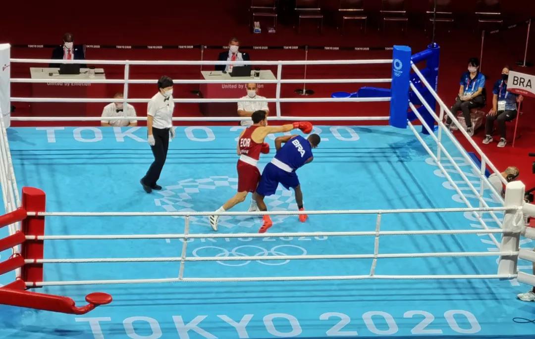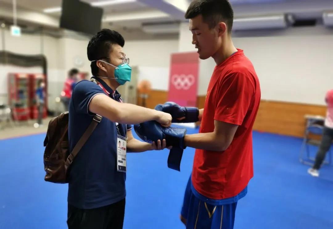 东京奥运会拳击热身馆,好博体育工作人员帮助运动员穿戴拳击手套