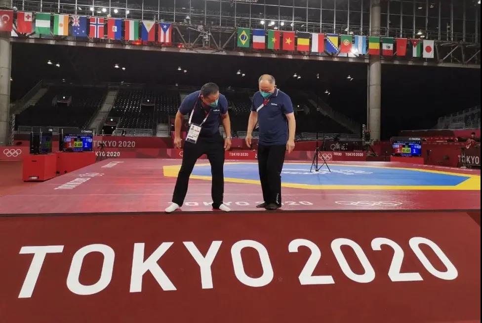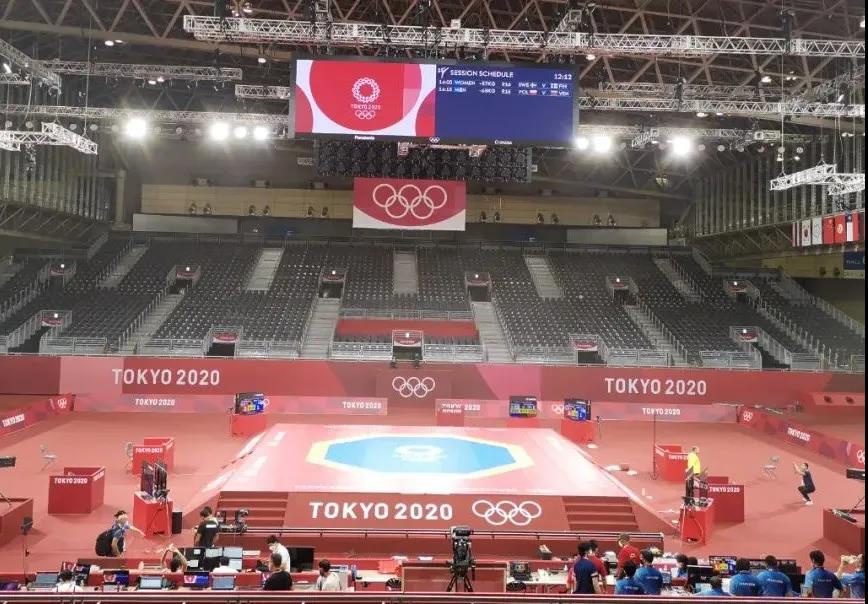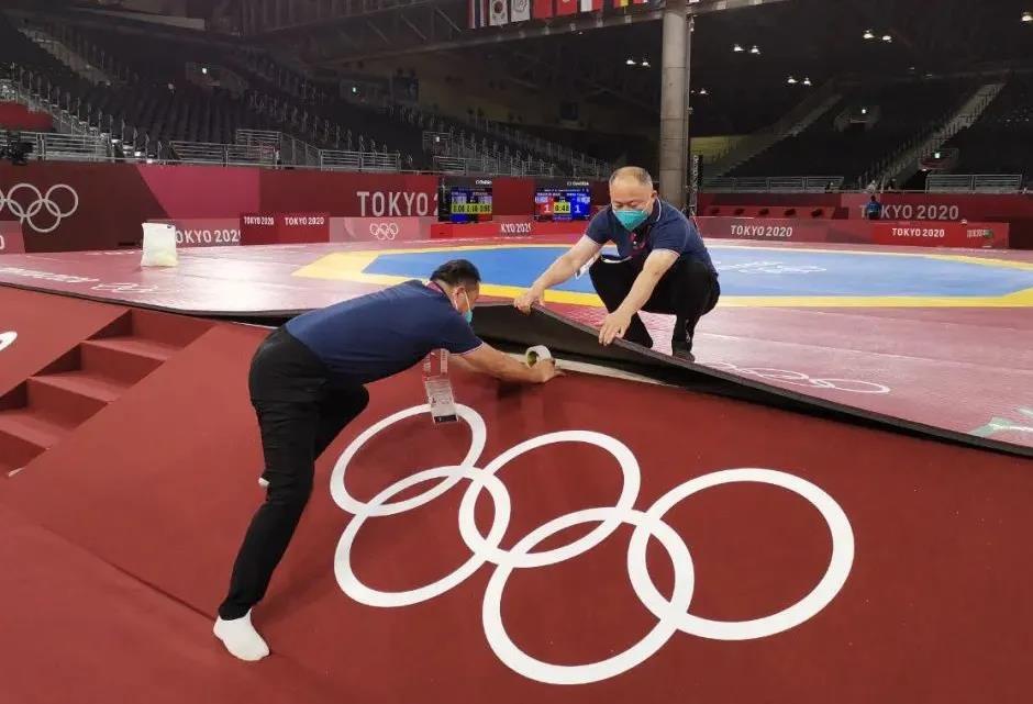 2021年7月20日,日本武道馆——奥运会柔道比赛场地。好博体育东京奥运会服务保障团队正在布置、安装柔道器材。