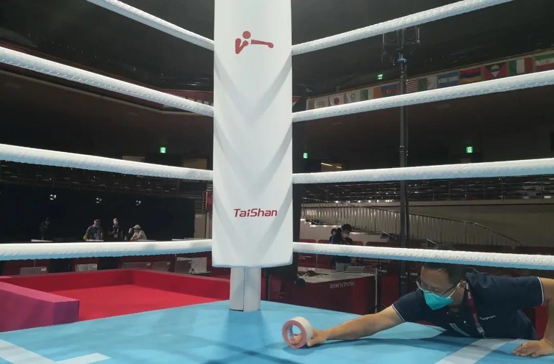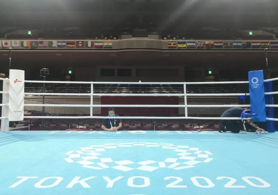 2021年7月21日,日本东京国技馆——奥运会拳击比赛馆。好博体育东京奥运会服务保障团队正在检查调试拳击器材。